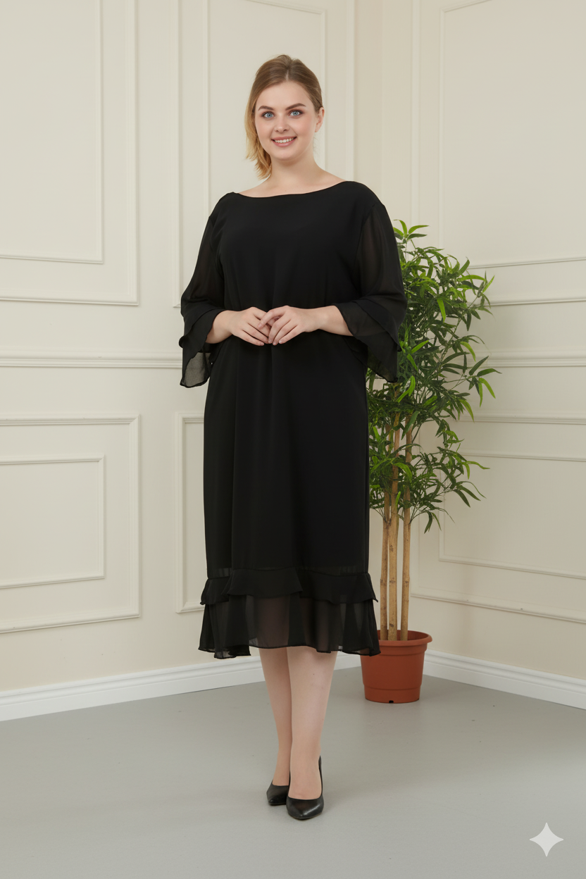 Kol ve Etek Ucu Fırfırlı Şifon Elbise