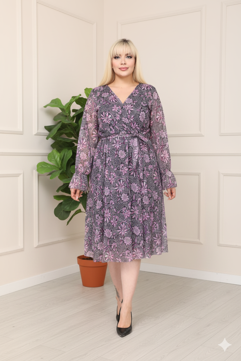 Hafif ve dökümlü yapısıyla her adımda zarafeti hissettiren bu kruvaze yaka şifon elbise, feminen stilin en güçlü temsilcilerinden biri. V yaka formundaki kruvaze kesimi, boynu ve dekolteyi zarifçe vurgularken, ince bel detayı vücut hatlarını kusursuzca ortaya çıkarır. Uçuş uçuş şifon kumaşı sayesinde özel davetlerden günlük kombinlere kadar geniş bir kullanım alanı sunar. Topuklu ayakkabılarla elegan bir görünüm yakalayabilir ya da sandaletlerle gündelik şıklığı kolayca yakalayabilirsiniz.
