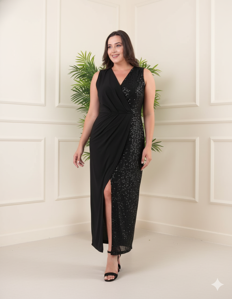 Özgün tasarımı ve göz kamaştıran detaylarıyla bu abiye elbise, büyük beden şıklığını baştan tanımlıyor. Simli siyah kumaşın ihtişamı ile siyah satenin zarafeti tek bir parçada buluşuyor. Asimetrik kesimiyle vücut hatlarını kusursuzca sararken, rahat kalıbı sayesinde konforundan ödün vermezsin.