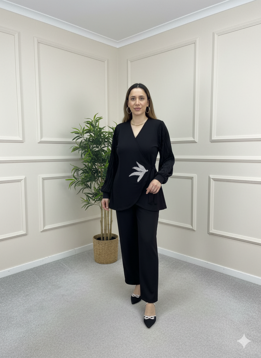 Göz alıcı ama sade bir şıklık arayan kadınlar için özel olarak tasarlandı! Parlak saten kumaşı ve dikkat çekici kol detaylarıyla bu takım, günün her anına zarafet katıyor. Bel kısmındaki payet işlemeli desenle sofistike bir hava kazanan bu model, özel günler, davetler ve toplantılar için mükemmel bir seçenek.
