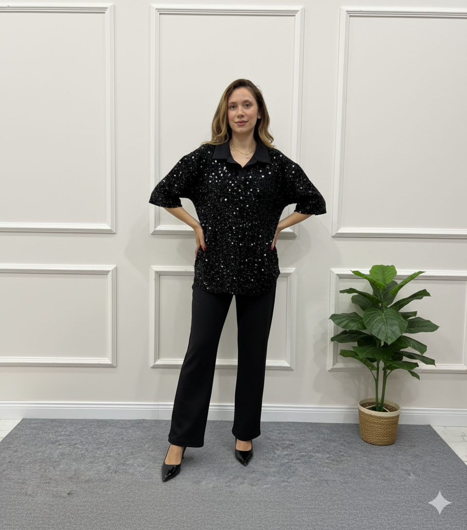 Yakası Polo Yaka olup ön tarafı payet arka tarafı düz kumaştır.