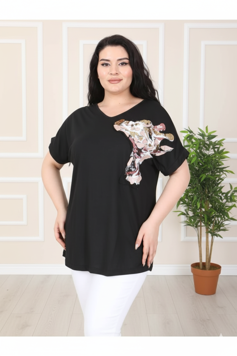 Modern şıklığı ve rahatlığı bir arada sunan bu büyük beden siyah bluz, ön kısmındaki renkli pul payet aplikesiyle dikkat çeker. V yaka kesimi ve dökümlü yapısı sayesinde hem günlük kullanım hem de özel günlerde tercih edilebilecek şık bir alternatiftir. Hafif kumaşı sayesinde gün boyu konfor sağlar. İç kısmında astarlı dantel detayları mevcuttur. Pantolon veya eteklerle kolayca kombinlenebilir.
